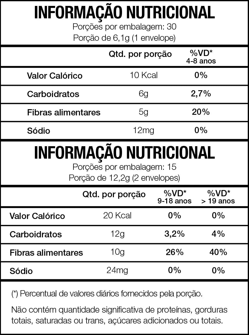 Goma Arábica, Fibra Solúvel de Milho, Milho Solúvel, Frutooligossacarídeos (Fibras Alimentares).